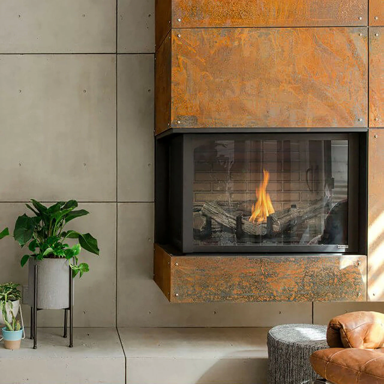 The Corner – creating atypical and surprising corner spaces. The Divine Corner unit is a multi-sided direct vent fireplace characterized by a unique two sided viewing area. Rock or tile can be installed over the firebox frame for a clean finish look.