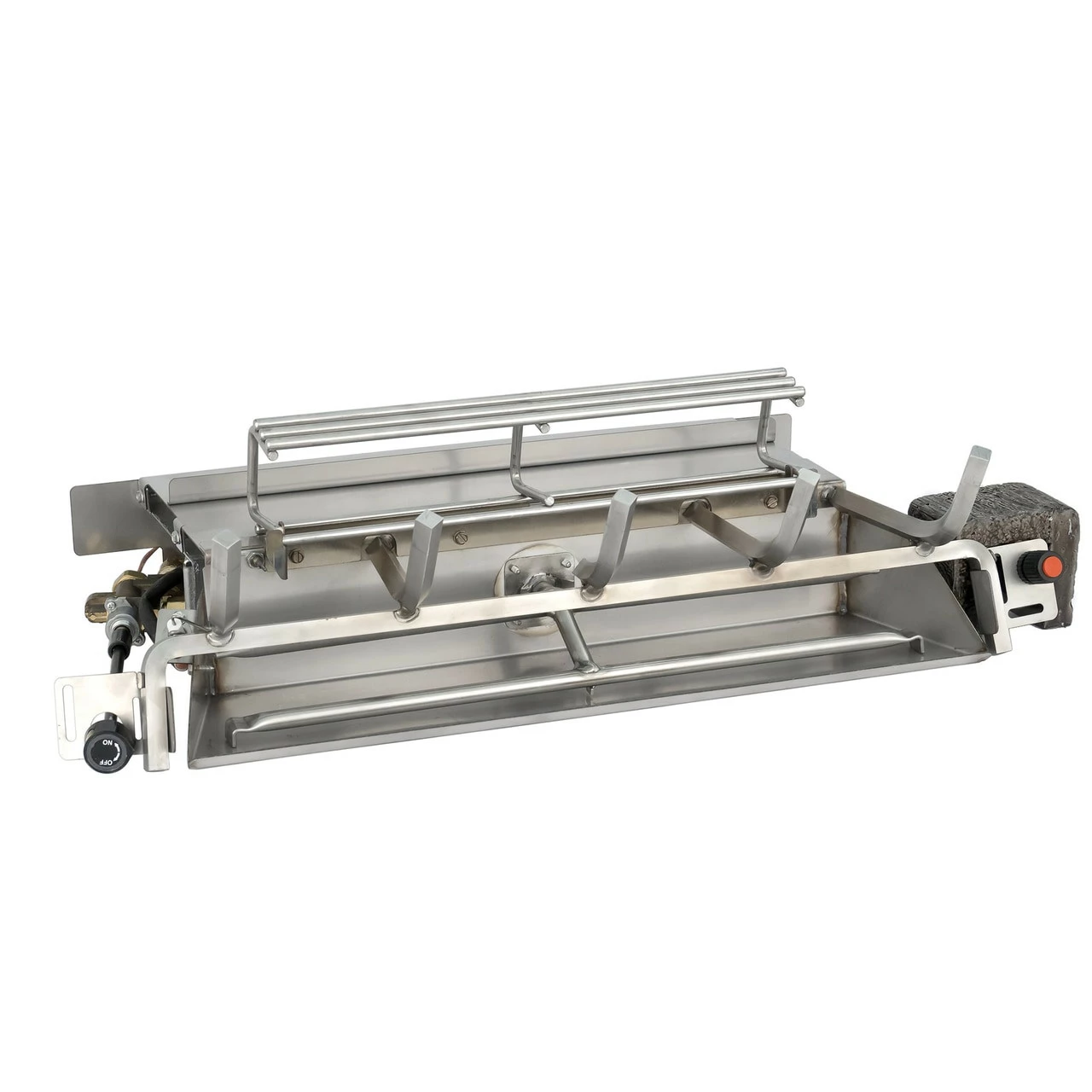 This stainless steel burner system Features an Exclusive stainless steel “booster grid” that acts as a catalyst to increase the intensity of the fire. It offers multiple control options including remote, manual and match lit. Compatible with Charred Evergreen Oak & Charred Evergreen Split Oak logs only. Available for Natural or LP gas.